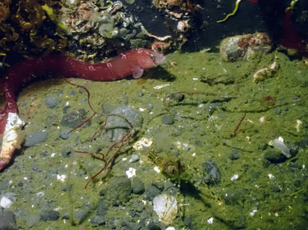Dive Site Info: From the split in the fence, enter the water. The pipe starts at 8’ during low tide but is harder to see while buried in algae and sand. If you swim out to about 20’, you will find the pipes easier. The pipe is approximately straight out from the split in the fence. It runs down to 85’. If you find some blue plastic milk crates, head north to find the pipes, you are about 30-40’ south of the pipe. Look around the cement supports for signs of Giant Pacific Octopus. They are hiding out there. If you go to the south from the pipes at 80’ or so, you will find some sea whips. Take some time during your safety stop to enjoy the shallows. Plenty of life lurking around in the algae.